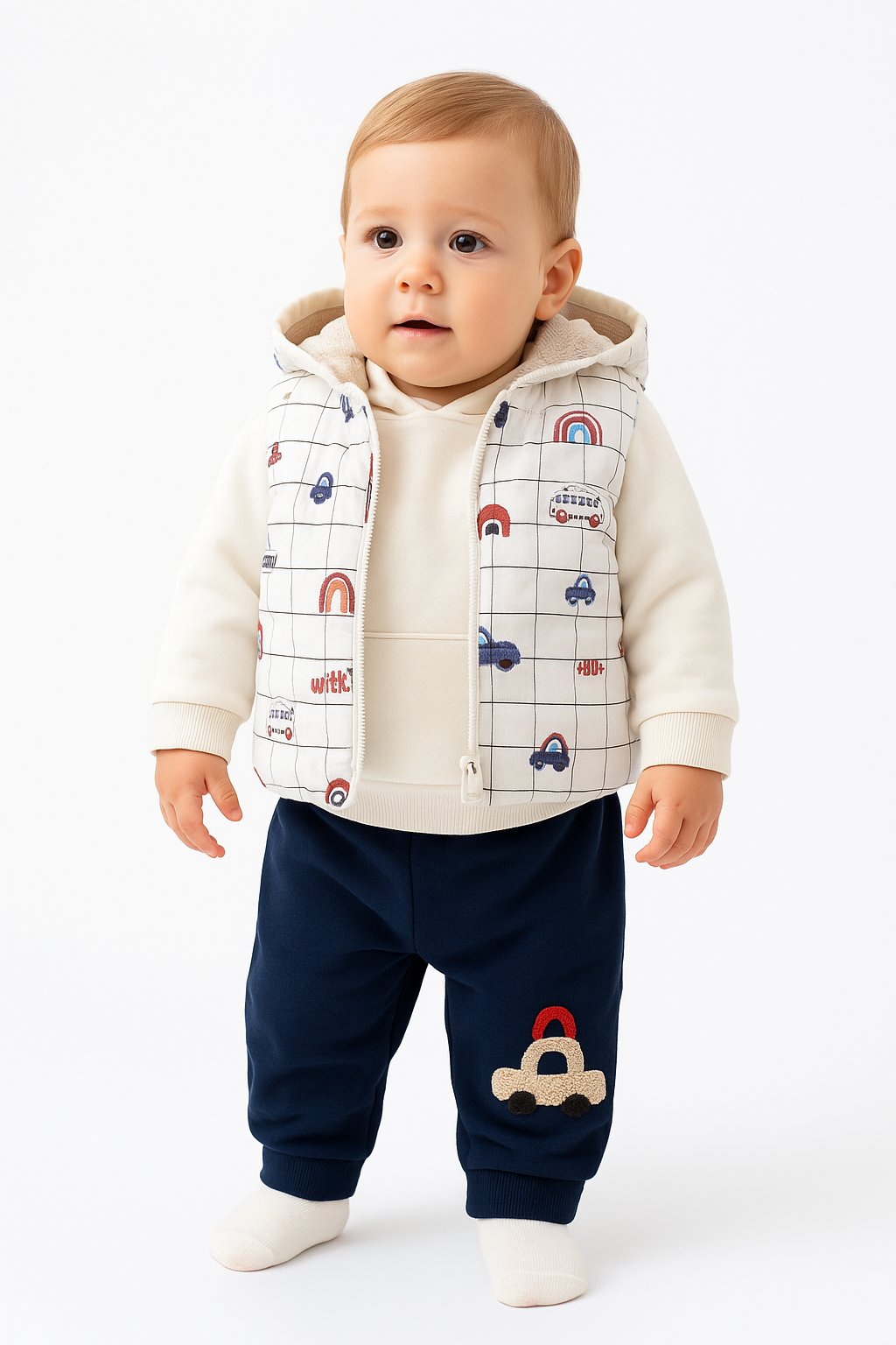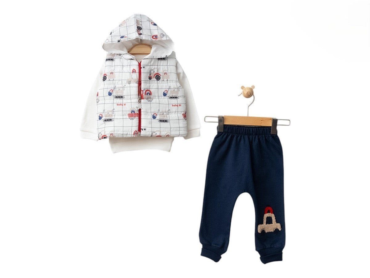 3-teiliges Baby Outfit – Hose, Oberteil & gesteppte Kapuzenweste mit Auto-Motiv
