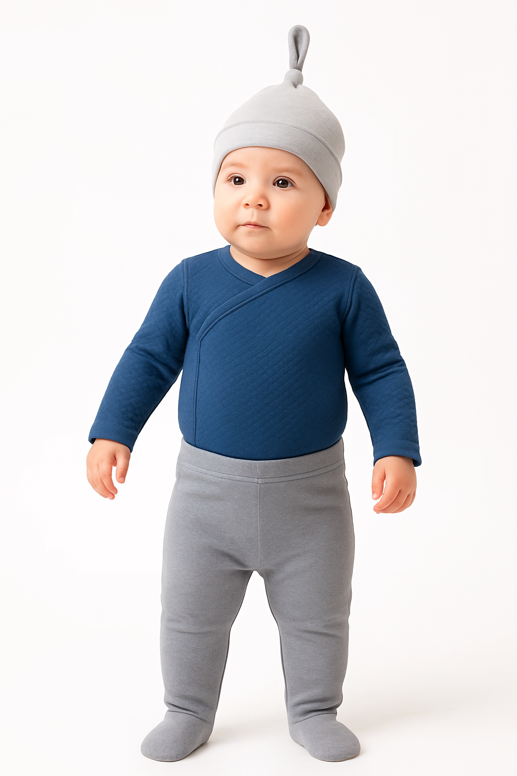 Dieses hochwertige 3-teilige Baby Set von Moi Noi bietet deinem Baby rundum Komfort und Stil. Es besteht aus einem langärmligen Wickelbody in Dunkelblau, einer bequemen Hose mit Fuß in Hellgrau sowie einer passenden Knotenmütze.