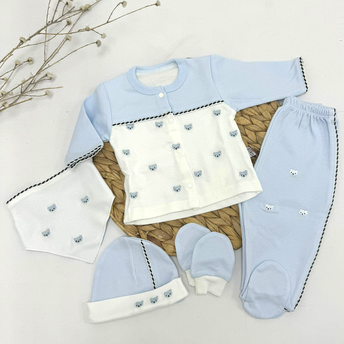 5-teiliges Baby Jungen Set | Blau-Weiß | Süße Bärchen-Stickerei
