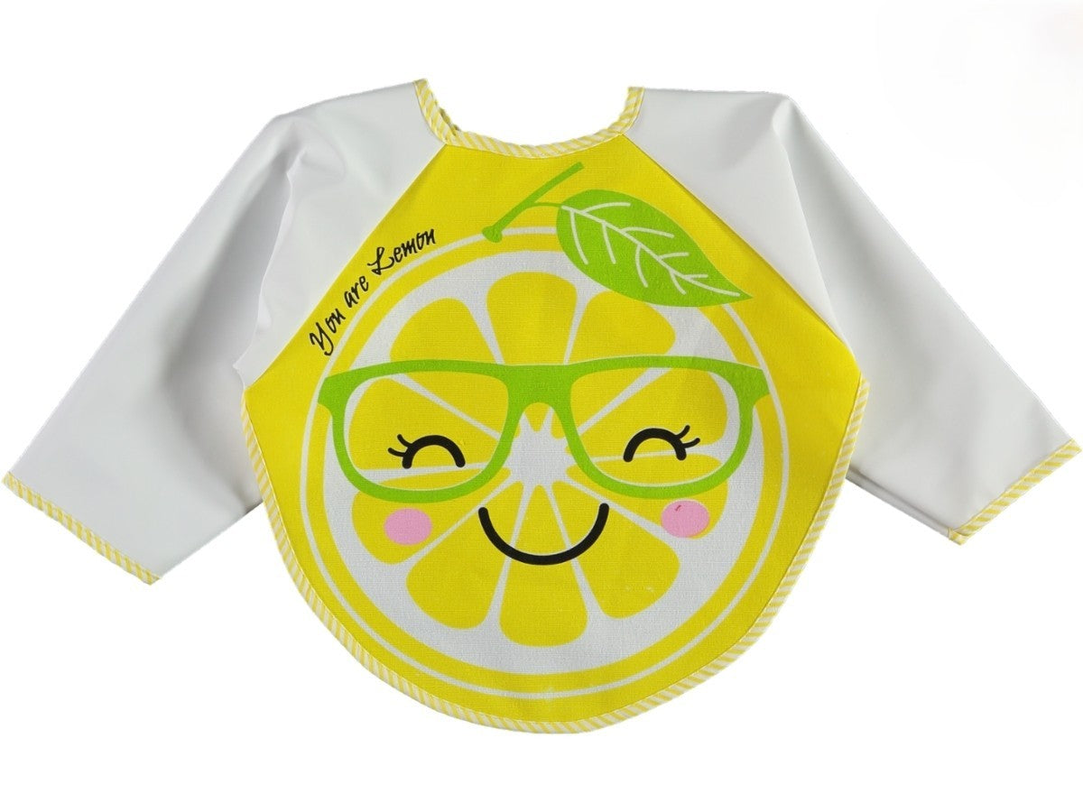 Praktisches Langarm-Lätzchen mit fröhlichem Zitronen-Motiv. Dank wasserabweisendem Material schützt es Kleidung zuverlässig beim Essen, Malen oder Basteln. Einfach abwischbar und schnell wieder sauber – ideal für den Alltag mit kleinen Kindern. Durch die langen Ärmel ist das Lätzchen besonders sicher und verhindert Kleckern auch an den Seiten.