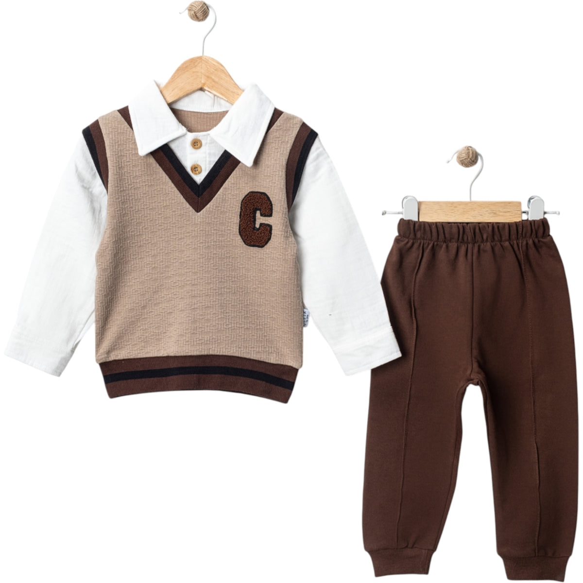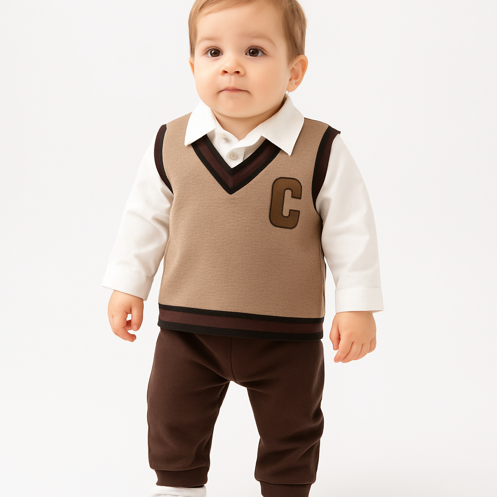 Dieses stilvolle 2-teilige Baby-Set vereint Komfort mit einem eleganten Look. Das Oberteil ist ein weißes Langarmshirt mit fest vernähtem Plunder in Beige und braunen Details – dadurch wirkt es, als hätte dein kleiner Schatz Hemd und Weste an, bleibt aber super praktisch zum Anziehen.
