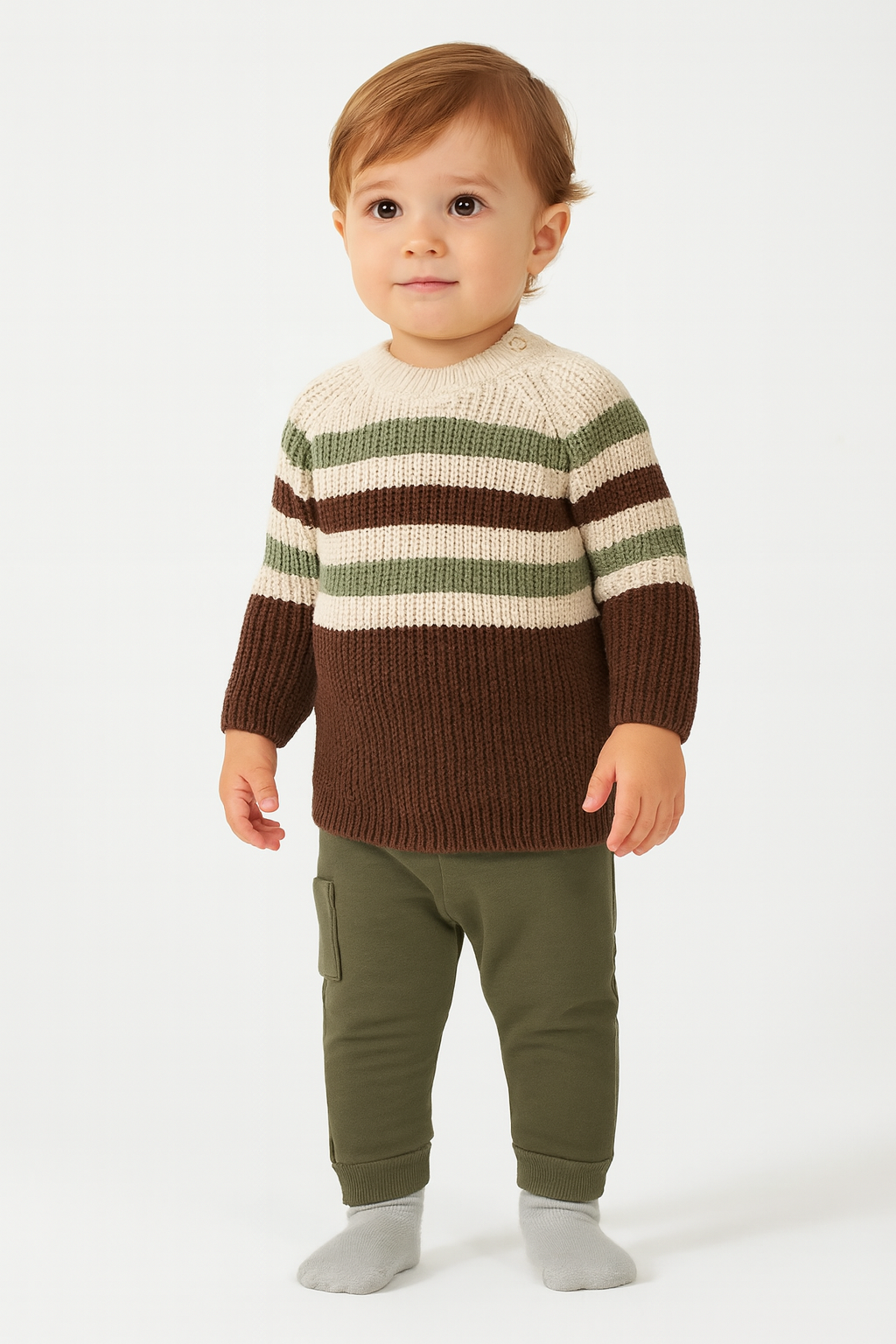 Dieses gemütliche Baby-Set vereint Wärme, Komfort und einen stilvollen Look. Der weiche Strickpullover mit Blockstreifen ist aus 100% Baumwolle gefertigt und besonders hautfreundlich. Dazu passt die bequeme Hose mit elastischem Bund, die viel Bewegungsfreiheit bietet – perfekt für aktive kleine Entdecker.