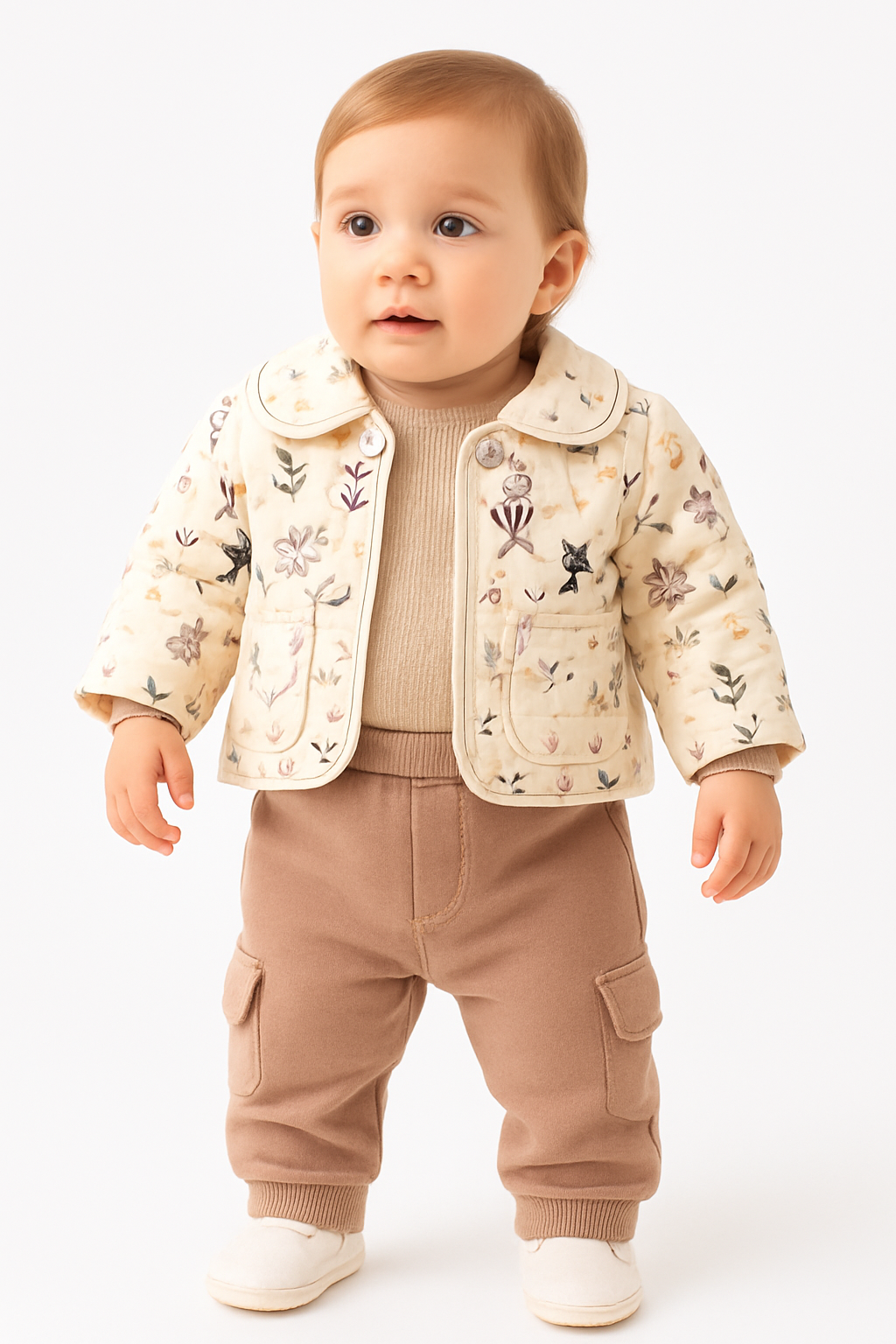 Dieses süße 3-teilige Baby-Set ist die perfekte Kombination aus Komfort und Stil. Es besteht aus einer warmen Jacke mit verspieltem Muster, einer bequemen Hose mit praktischen Taschen und einem weichen Sweatshirt.