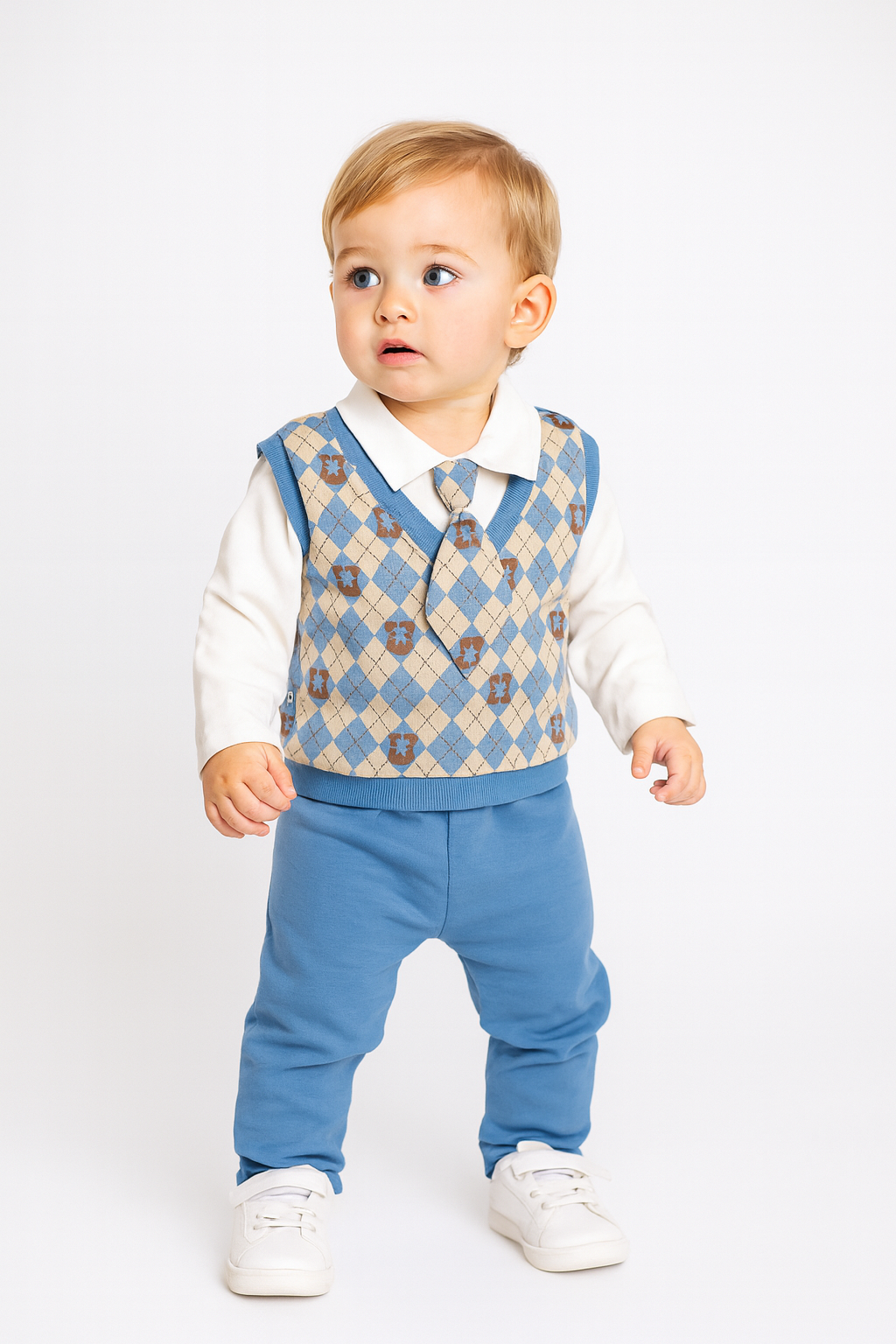 Dieses elegante 2-teilige Baby Jungen Set besteht aus einem Langarmshirt mit Kragen und süßer Pullunder-Optik im Argyle-Muster sowie einer passenden Hose in Blau.