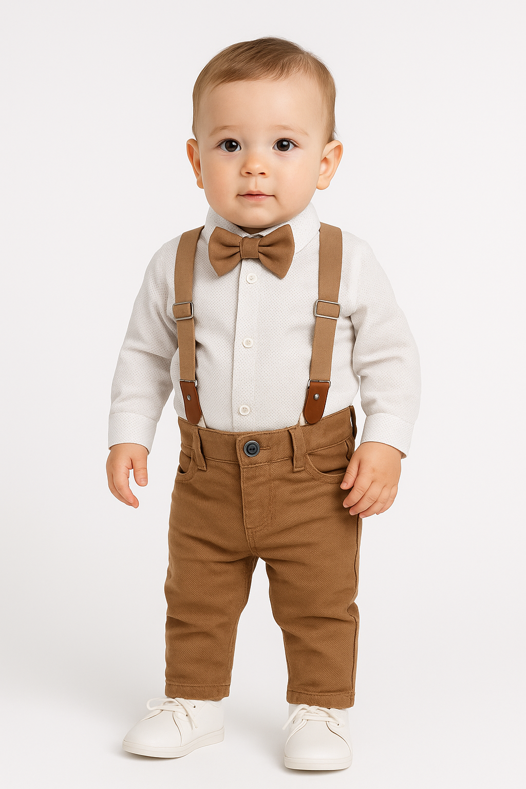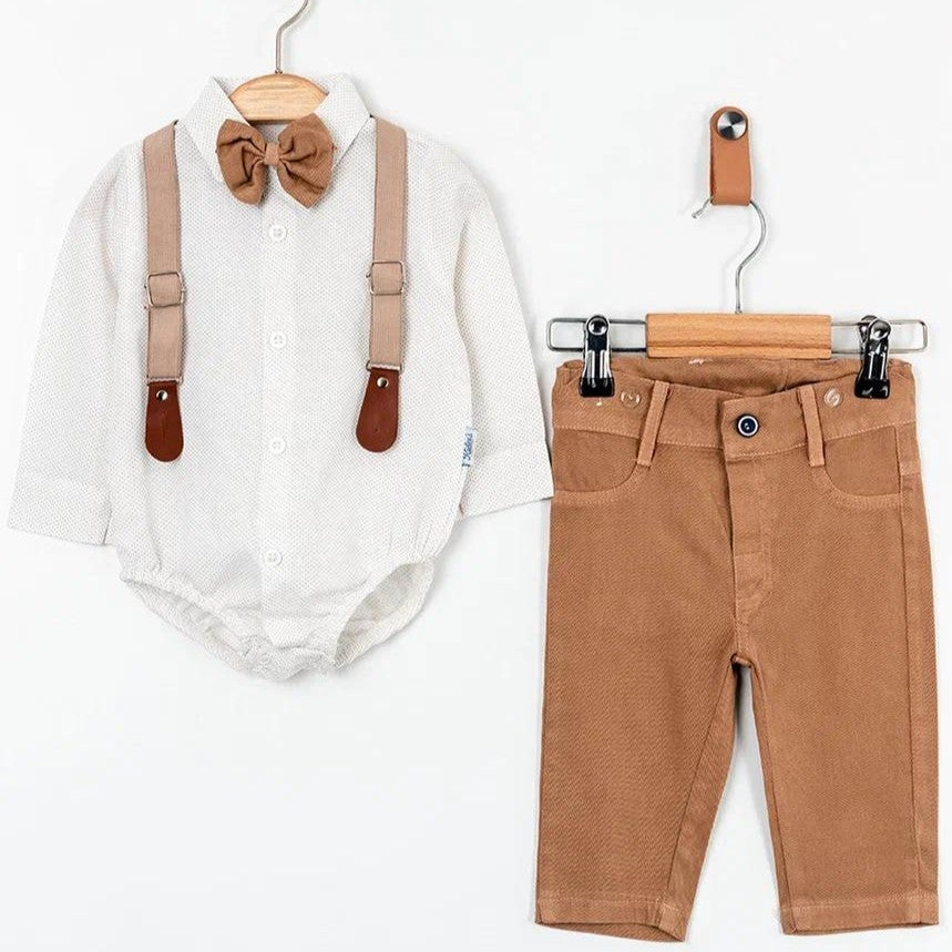 Dieses edle Baby Jungen Outfit ist ein absoluter Hingucker für besondere Anlässe! Das Set besteht aus einem weißen Bodyhemd mit Kragen, passender Fliege und abnehmbaren Hosenträgern sowie einer schicken braunen Hose.