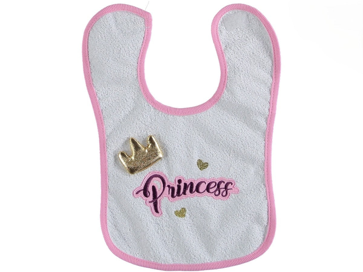 Süßes Baby Lätzchen aus weichem Frottee mit rosa Einfassung. Verziert mit goldener Krone, kleinen Herzchen und dem Schriftzug „Princess“. Das Lätzchen schützt zuverlässig vor Kleckereien und ist dank weichem Material angenehm zu tragen. Praktisch und zugleich niedlich – ideal für kleine Prinzessinnen.