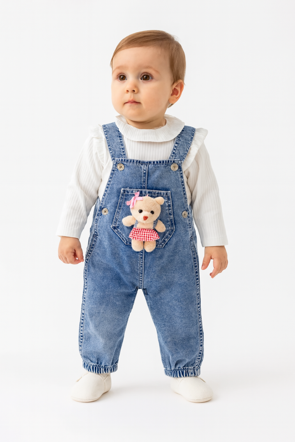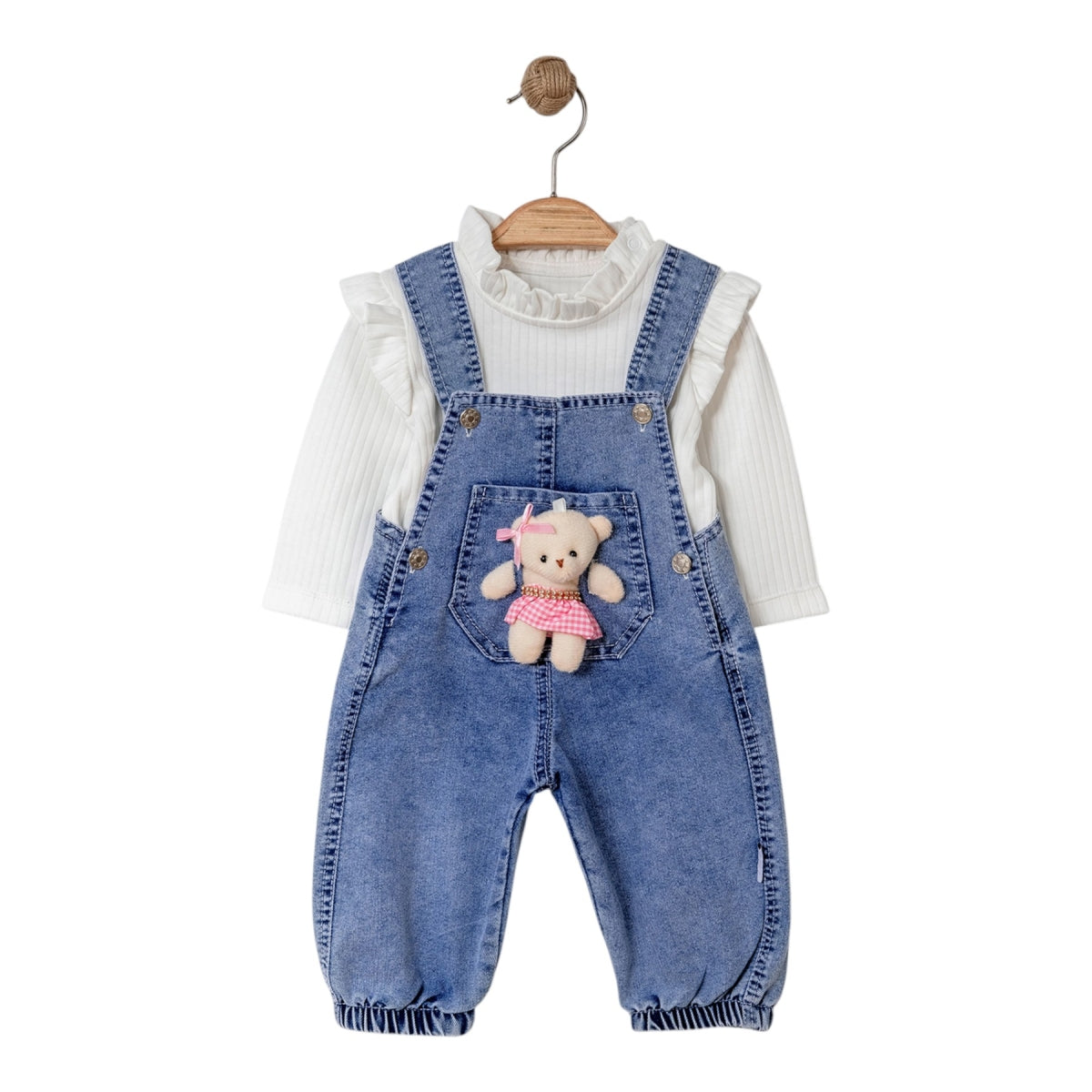 Dieses niedliche Baby Latzhosen-Set ist ein echter Hingucker! Die blaue Latzhose in Jeansoptik kommt mit einem abnehmbaren Teddybär-Spielzeug in der Fronttasche – perfekt zum Spielen und Kuscheln. Dazu gehört ein weiches, weißes Langarmshirt, das den Look komplett macht.