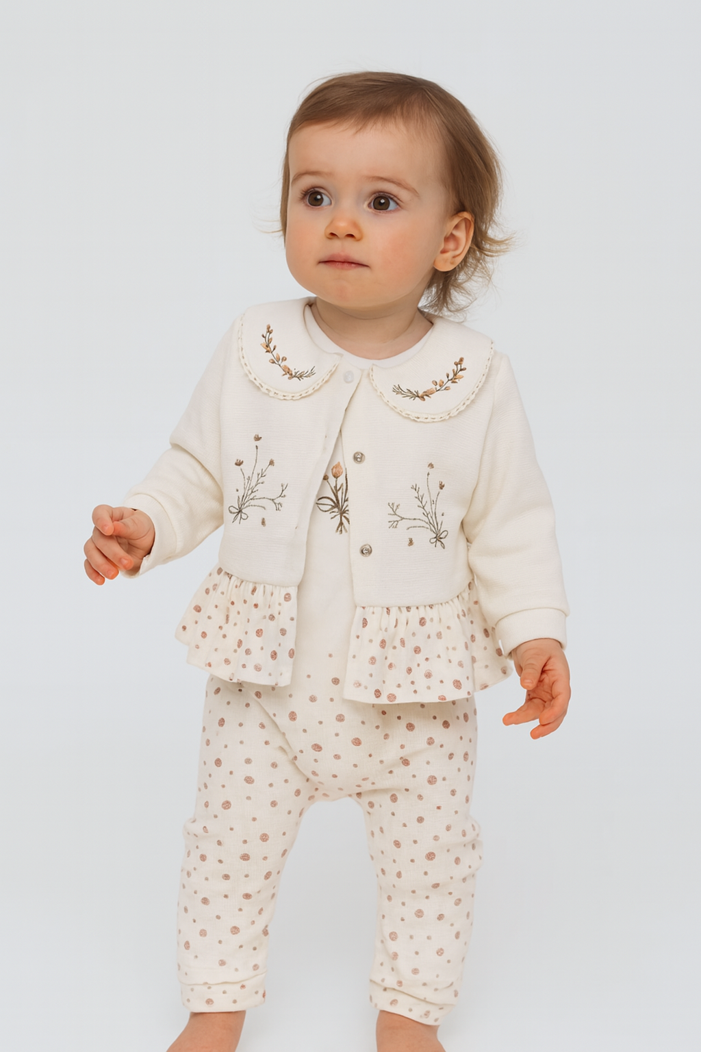 Dieses bezaubernde 3-teilige Baby Outfit ist die perfekte Wahl für kleine Mädchen. Das Set besteht aus einem weichen Body, einer bequemen Hose und einer süßen Jacke mit Blumenstickerei und Rüschenabschluss. Das verspielte Design mit feinen Blütenmustern macht dieses Outfit zu einem echten Hingucker – egal ob für den Alltag oder besondere Anlässe.