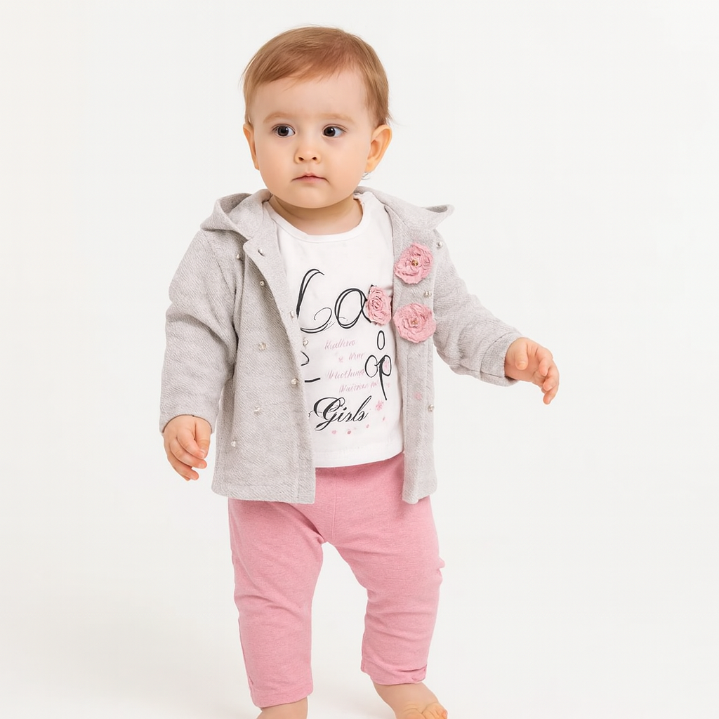 Baby Mädchen 3-teiliges Outfit – Jacke mit Perlen & Blumenapplikation, T-Shirt & Hose – 2 Farben