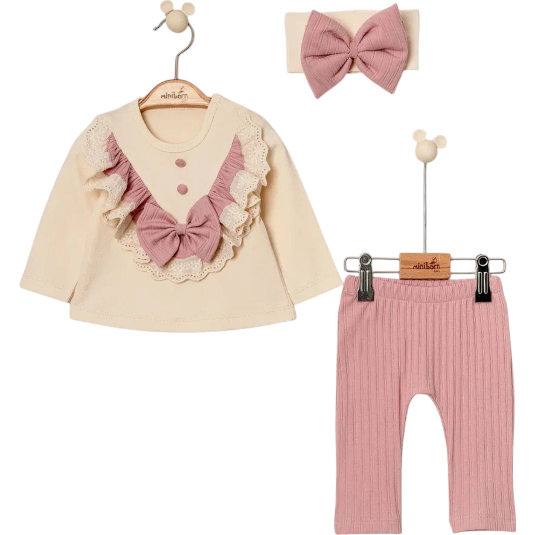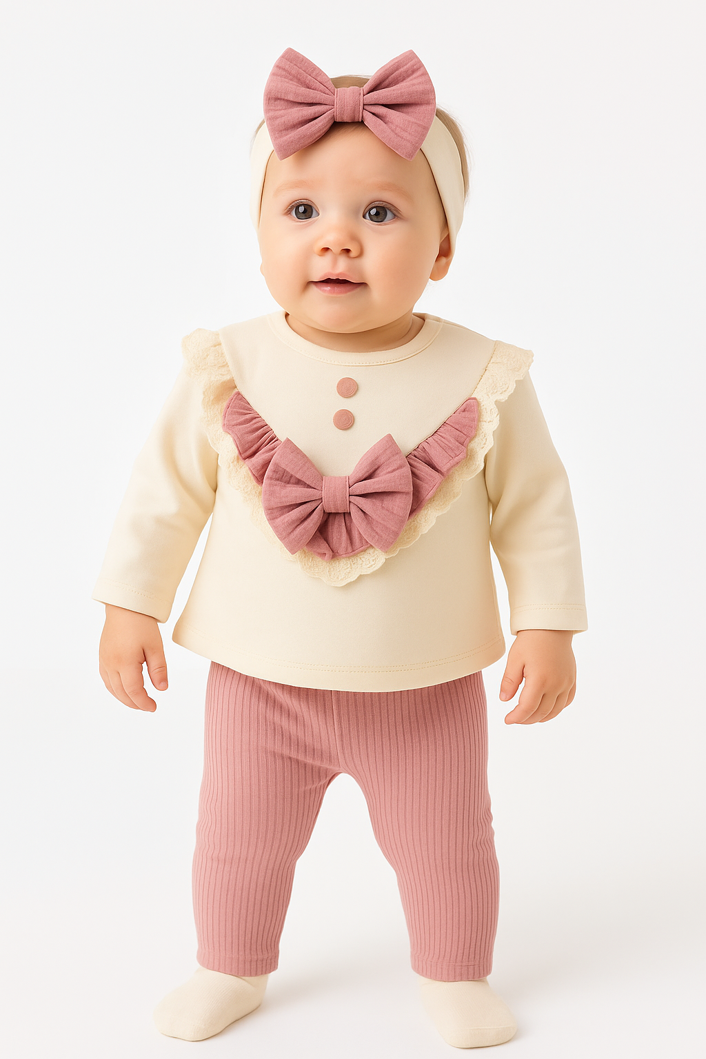 Ein traumhaftes 3-teiliges Baby Mädchen Outfit für kleine Prinzessinnen: Das cremefarbene Oberteil mit zarten Rüschen und dekorativer Schleife wird durch eine rosafarbene Rippenhose und ein passendes Haarband perfekt ergänzt. Gefertigt aus weicher Baumwollmischung für höchsten Tragekomfort – ideal für Alltag, besondere Anlässe oder als süßes Geschenk.