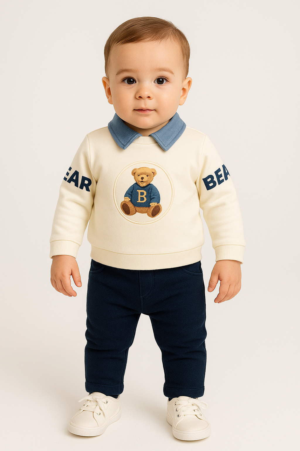 Dieses niedliche 2-teilige Baby Outfit besteht aus einem cremefarbenen Langarmshirt mit liebevollem Bärchen-Print und BEAR-Schriftzug sowie einer dunkelblauen Hose. Das Design ist sportlich-schick und gleichzeitig super bequem – perfekt für den Alltag deines Babys.