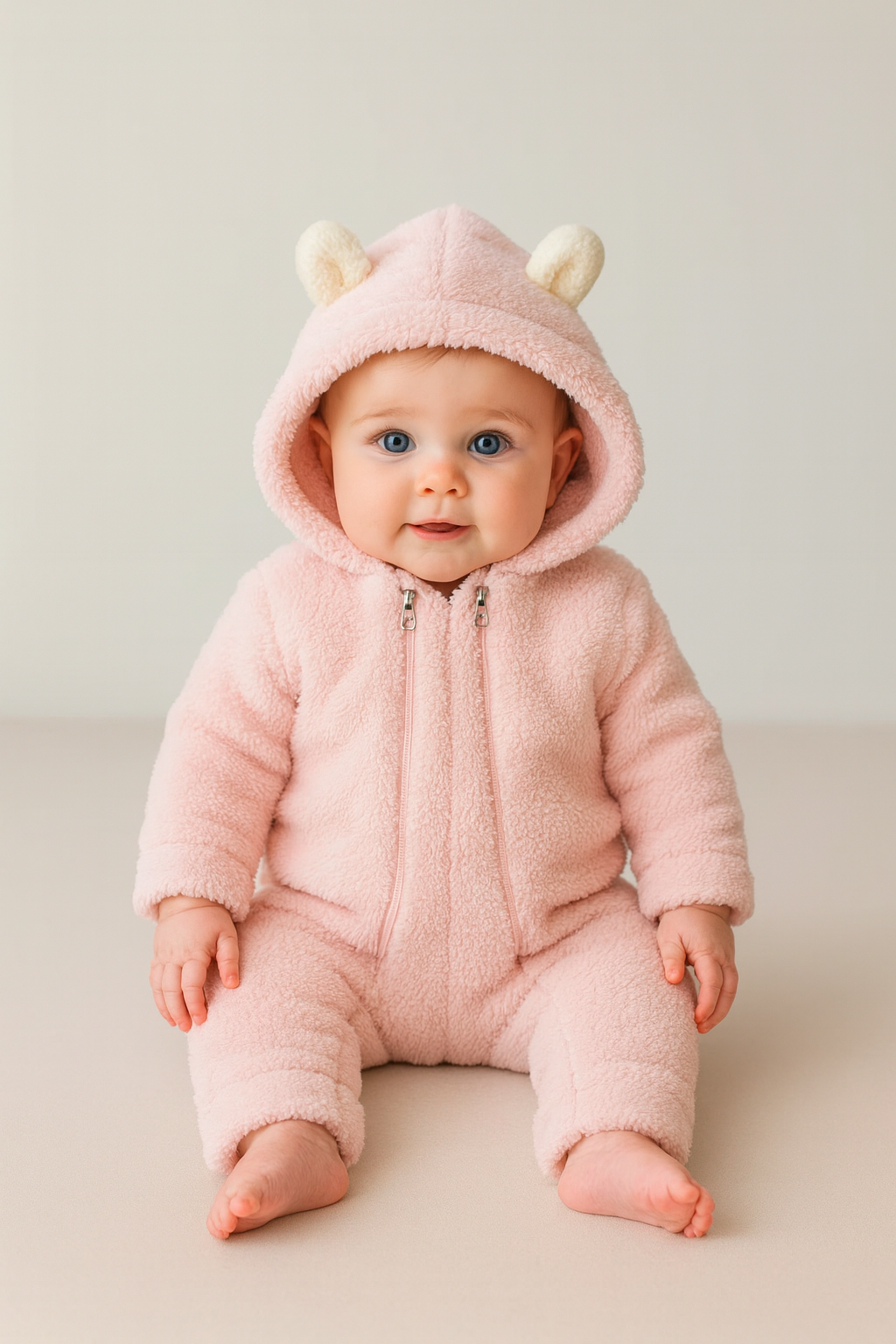 Baby Overall aus Teddyfleece – Rosa oder Grün mit Kapuze & Ohren