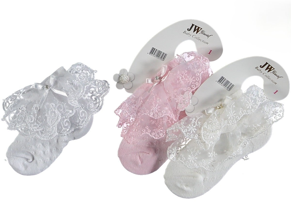 Zarte Baby Söckchen mit eleganter Spitzenverzierung und kleiner Schleife. Erhältlich in Weiß Rosa und Creme – perfekt für festliche Anlässe, Taufen oder besondere Momente. Weiches Material sorgt für hohen Tragekomfort, während die hübschen Details jedes Outfit abrunden. Ideal als Geschenk für Babys.