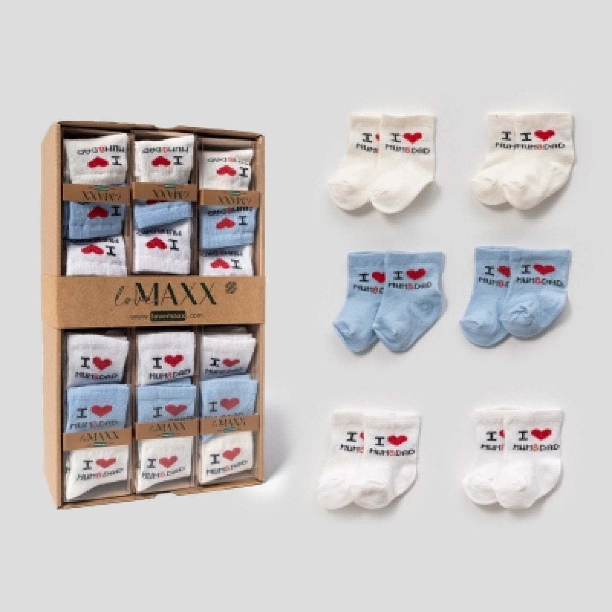 Baby-Socken Set 6-teilig – Blau/Beige/Weiß mit „I ❤️ Mum & Dad“ Design