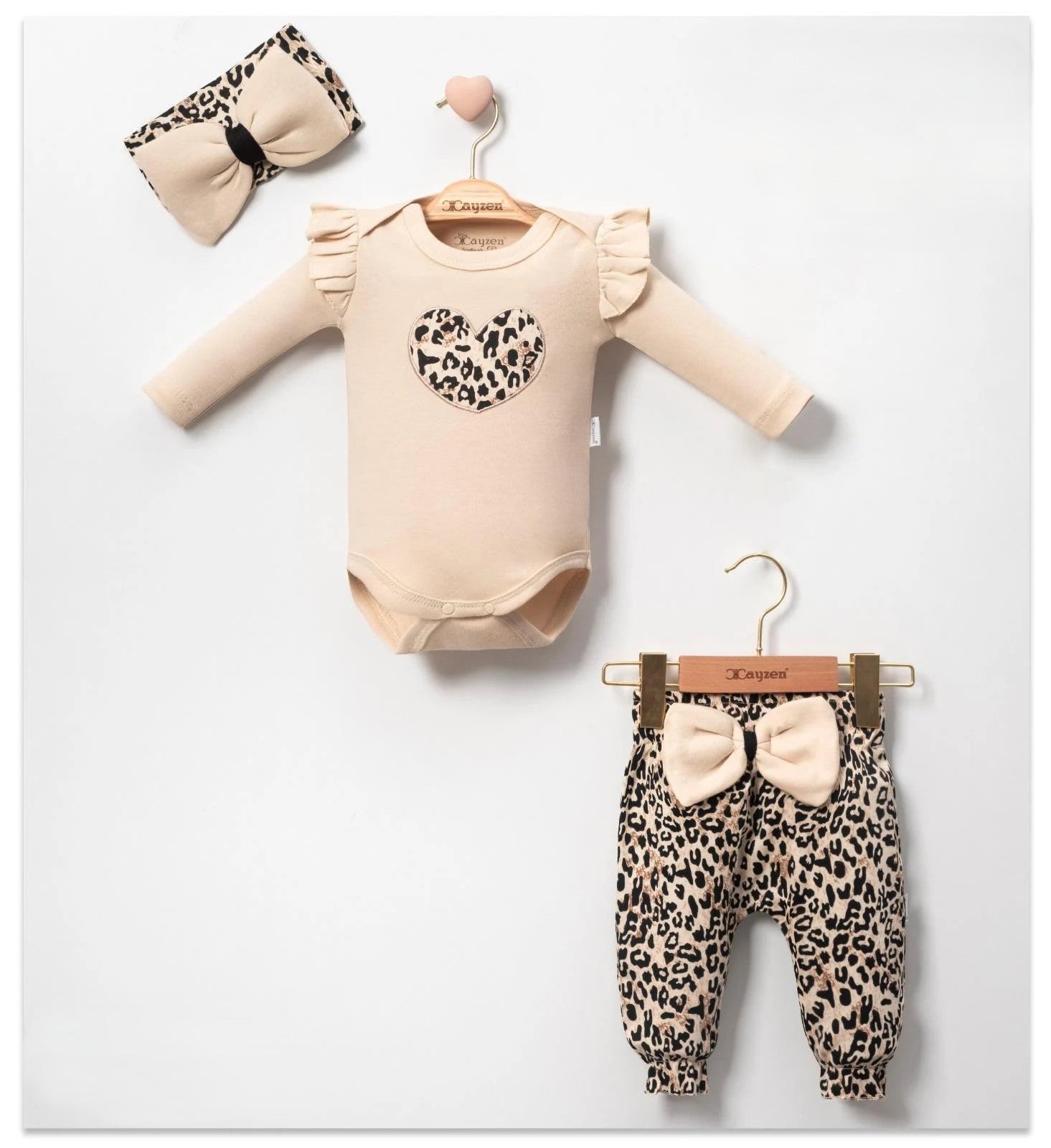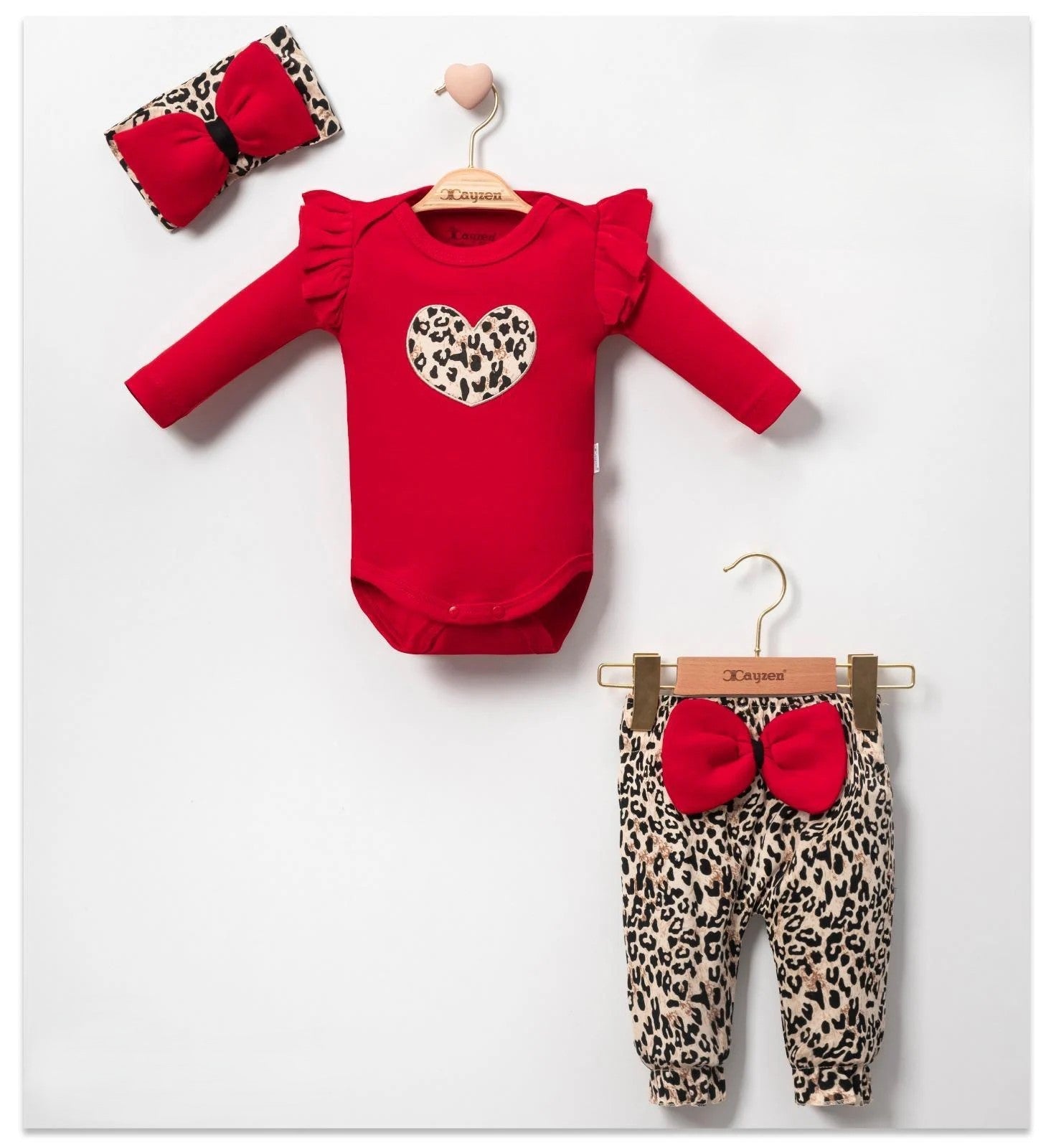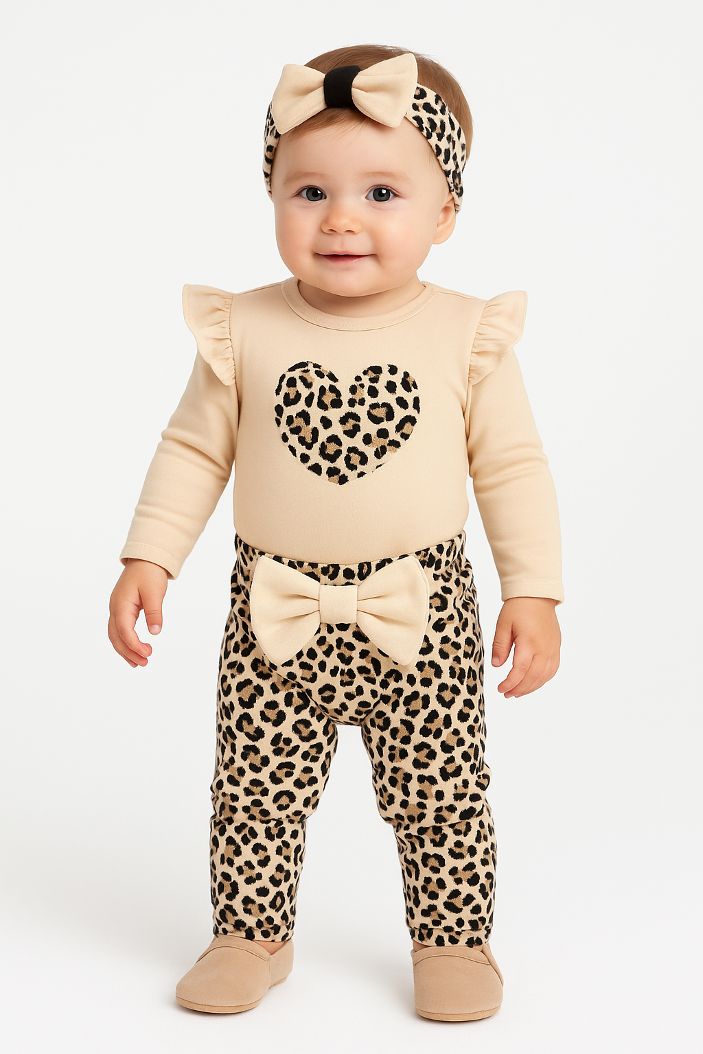 Dieses niedliche Baby-Set für Mädchen ist ein echter Hingucker! Es besteht aus einem langärmeligen Body mit Rüschen an den Schultern, einer bequemen Hose mit großer Schleife auf der Rückseite sowie einem passenden Haarband. Das Herz-Motiv mit trendigem Leo-Print macht das Outfit besonders stylisch und süß zugleich.