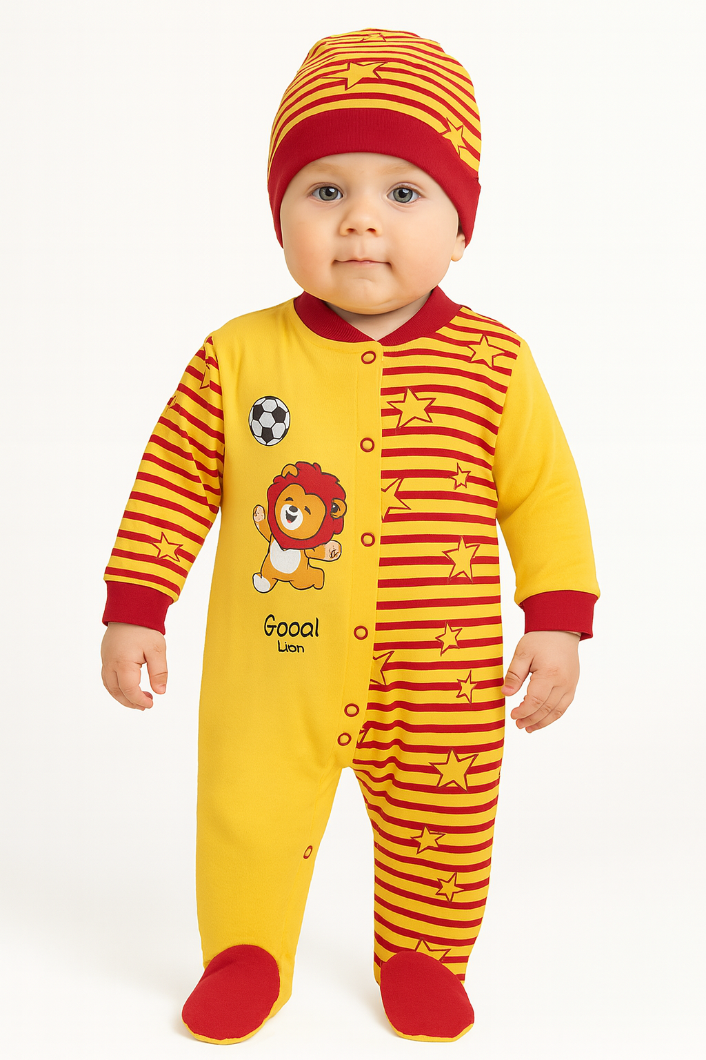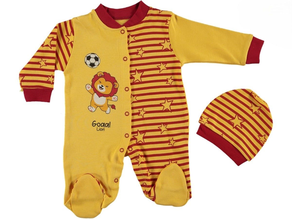 Mini Fan Strampler – Rot-Gelbes Fußballset mit Löwe & Mütze"